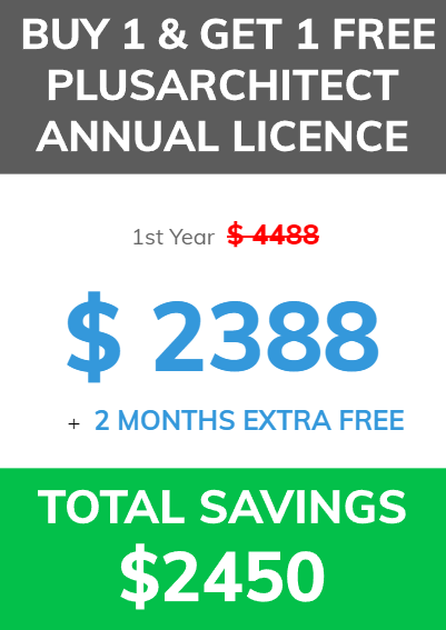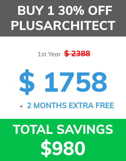 The 2 for 1 sale gets you 2×12 months of PlusArchitect a 12-month subscription to Sketchup that can be used on 2 of your computers simultaneously in the first 12 months. PLUS you get an extra 2 months on 1 of your PlusArchitect licenses. That’s an amazing deal!